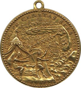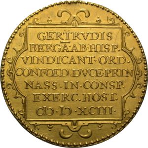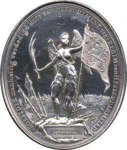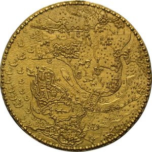 De Tachtigjarige Oorlog (1568-1648) werd uitgevochten in de Lage Landen, die in de 16de eeuw tot de meest verstedelijkte gebieden van Europa behoorden. Kenmerkend voor de Nederlandse vrijheidsstrijd zijn dan ook de vele belegeringen van steden. Vrijwel van het begin af aan vormden de successen die de Republiek boekten het onderwerp voor medailles, die ‘triomfpenningen’ werden genoemd. In goud werden dergelijke triomfpenningen geschonken aan officieren en militairen die een aandeel in de acties hadden, aan hoogwaardigheidsbekleders en zelfs aan buitenlandse ambassadeurs die op het punt stonden de Republiek te verlaten. Triomfpenningen werden in de Munthuizen van de verschillende provincies van de Republiek geslagen. Net als de munten uit die tijd hebben ze voorstellingen in heel laag reliëf. Vaak zijn de voorstelling ontleend aan kaarten en plattegronden.